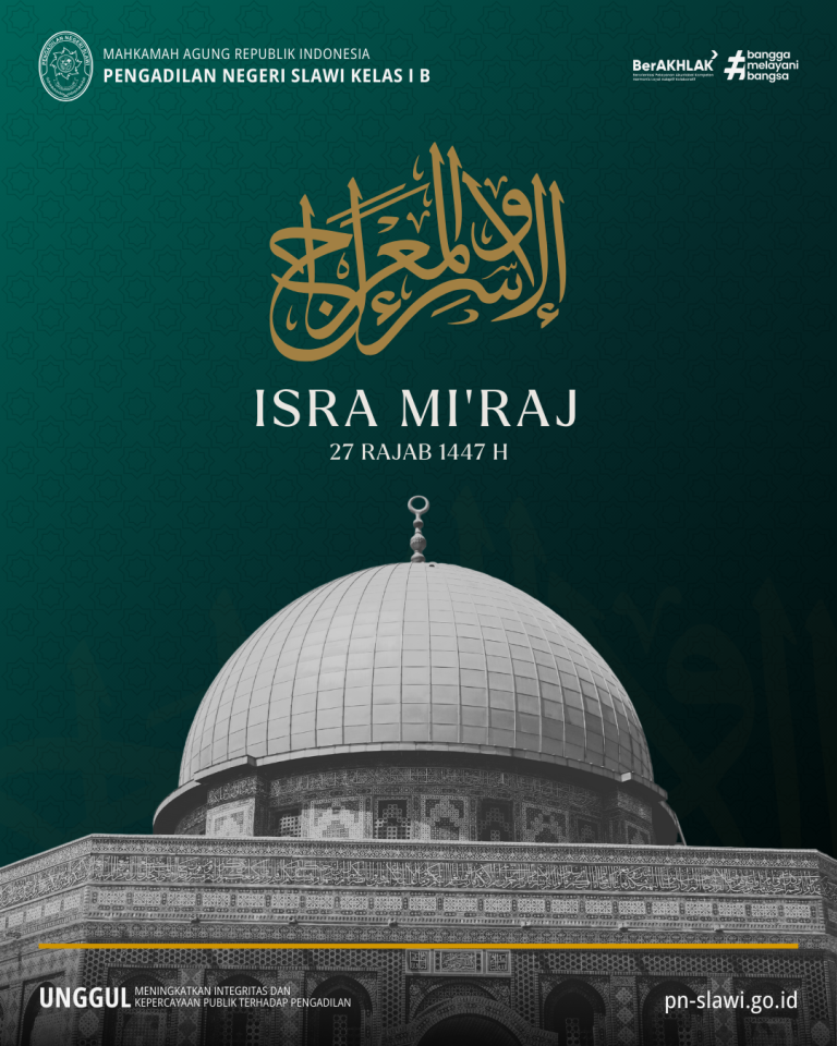 Keluarga Besar Pengadilan Negeri Slawi mengucapkan Selamat Memperingati Isra Mi’raj 1447 H Semoga Hikmah Perjalanan Suci Rasulullah SAW Senantiasa Meningkatkan