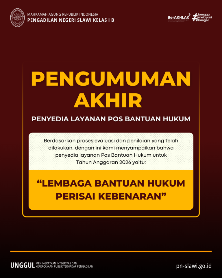 Berdasarkan proses evaluasi dan penilaian yang telah dilakukan, dengan ini kami menyampaikan bahwa penyedia layanan Pos Bantuan Hukum untuk Tahun