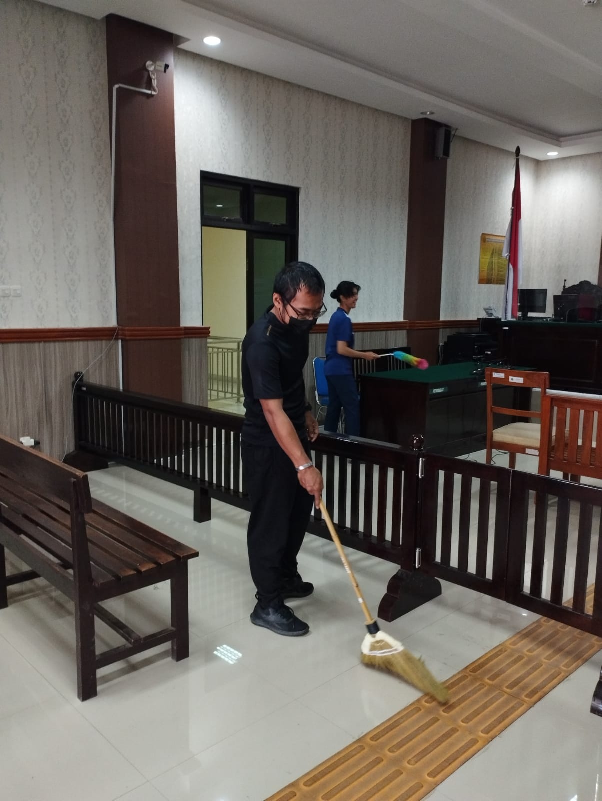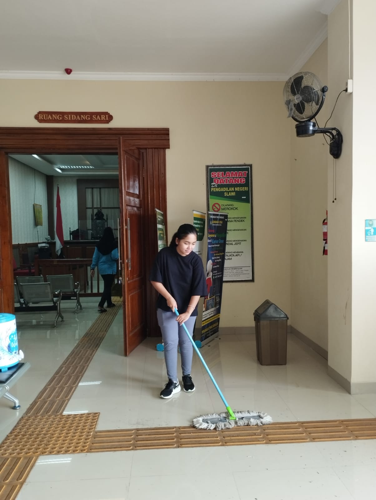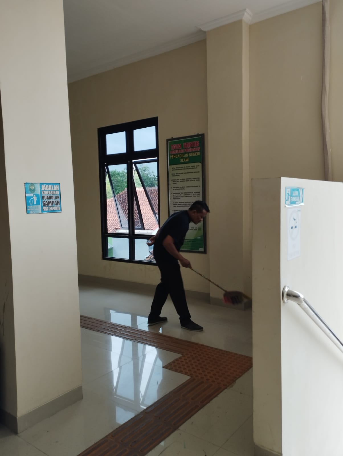 Pengadilan Negeri Slawi Kelas IB melaksanakan kegiatan kerja bakti membersihkan ruangan masing-masing yang diikuti oleh seluruh aparatur Pengadilan Negeri Slawi. Kegiatan diawali dengan briefing singkat yang dipimpin oleh Ketua Pengadilan Negeri Slawi, Bapak Eryusman S.H., kemudian dilanjutkan dengan kegiatan utama kerja bakti membersihkan ruangan Sidang dan halam sidang.