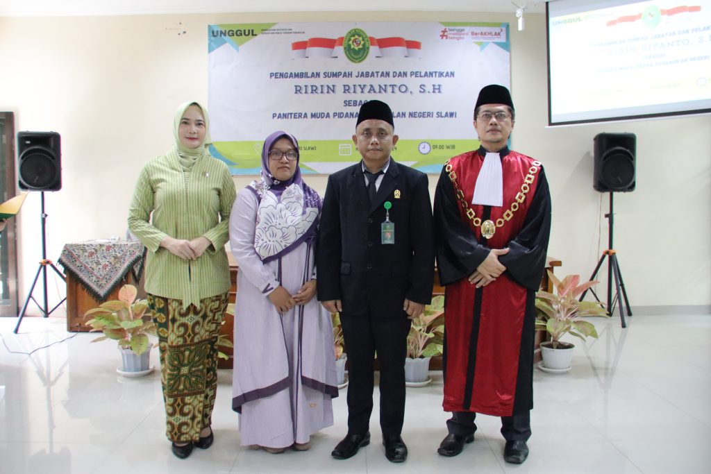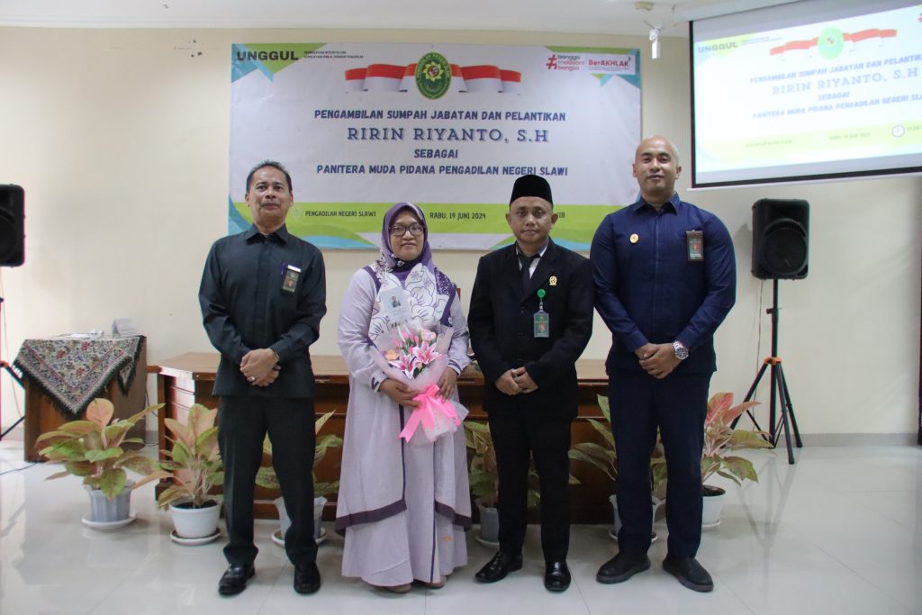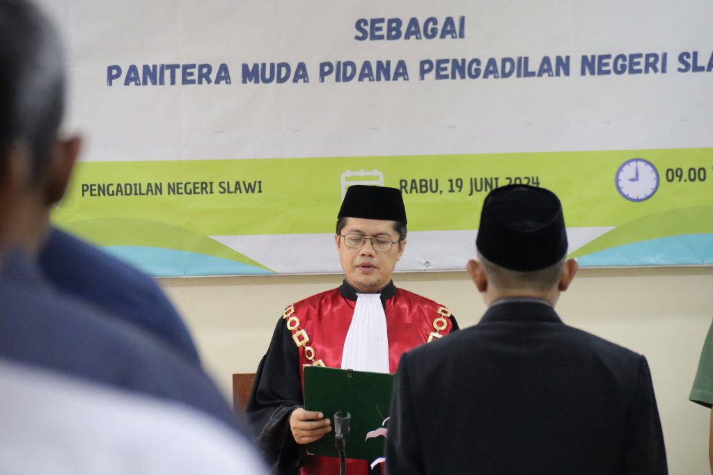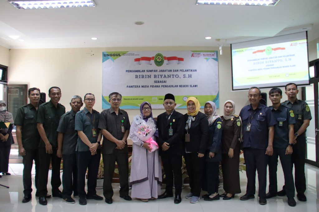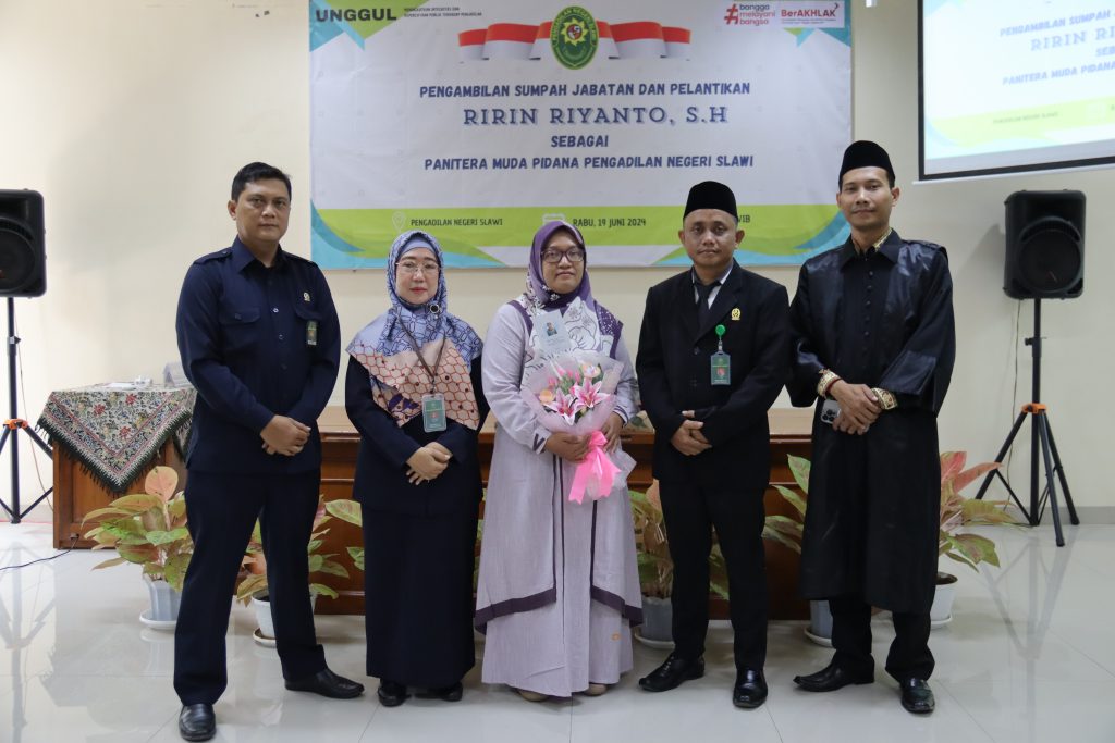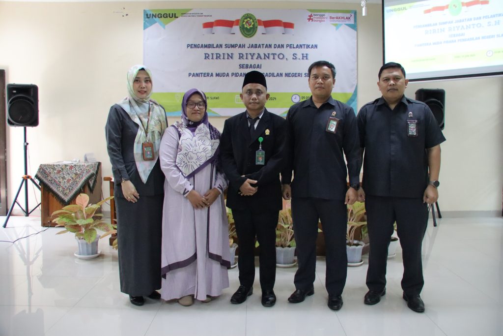 Slawi (19/6) – Bertempat di Aula Pengadilan Negeri Slawi, telah dilaksanakan Pengambilan Sumpah Jabatan dan Pelantikan Bapak Ririn Riyanto, S.H. sebagai Panitera Muda Pidana Pengadilan Negeri Slawi oleh Wakil Ketua Pengadilan Negeri Slawi Bapak Oki Basuki Rachmat, S.H., M.M., M.H..
