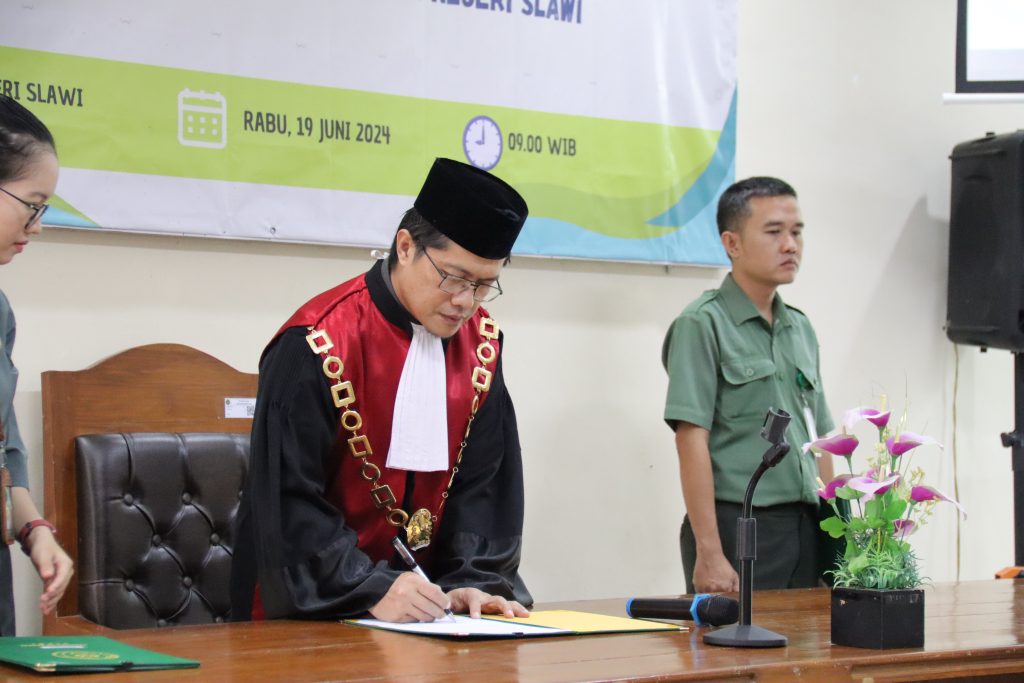 Acara diawali dengan menyanyikan lagu kebangsaan Indonesia Raya dilanjutkan Hymne Mahkamah Agung RI, pembacaan surat Keputusan Mahkamah Agung RI, pengambilan sumpah jabatan dan penandatangan berita acara sumpah, bertindak sebagai Saksi, Panitera Muda Perdata Pengadilan Negeri Slawi Bapak Eka Prasetiyawan, S.H., M.H. dan Panitera Muda Hukum Pengadilan Negeri Slawi Ibu Eswin Ririh Santosiarti, S.H. dilanjutkan dengan pembacaan dan penandatanganan Pakta Integritas.