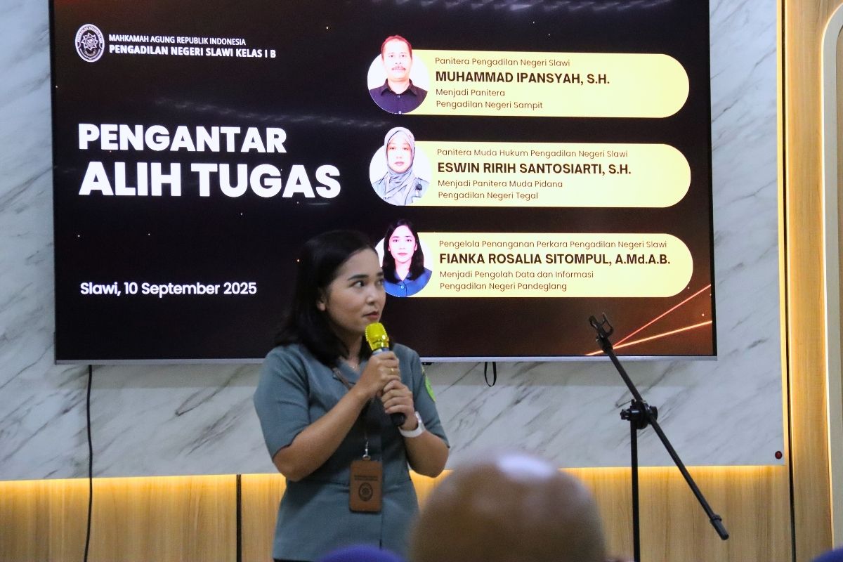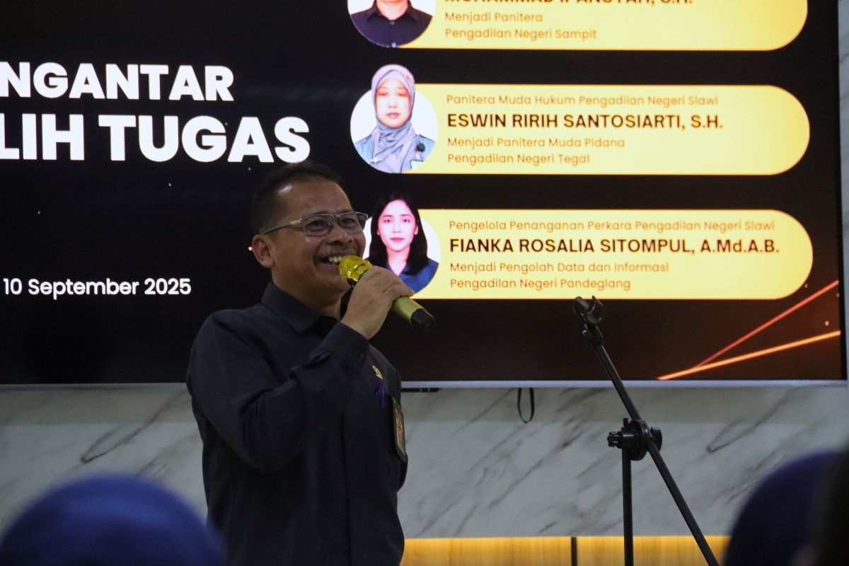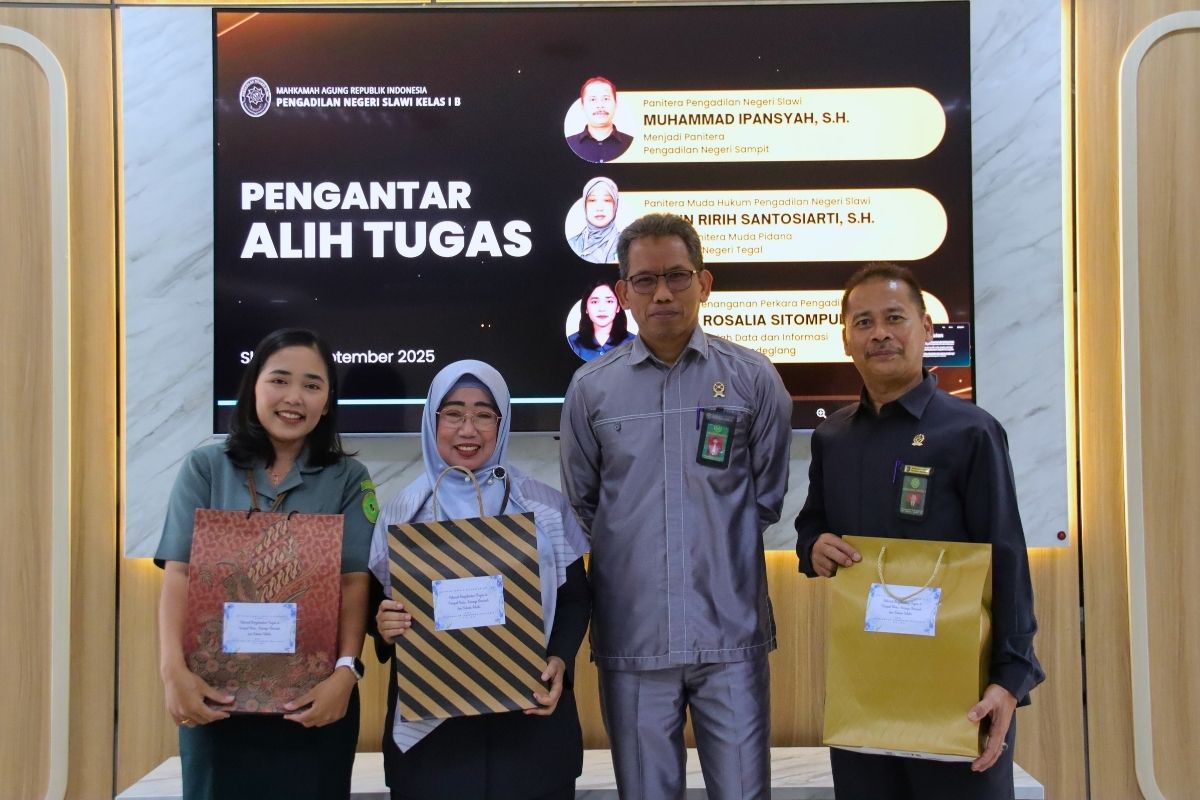 Slawi (11/9) – Pengadilan Negeri Slawi Kelas I B menyelenggarakan acara Pengantar Alih Tugas (10/9) bagi tiga pegawai yang mendapatkan penempatan baru di satuan kerja lain. Acara ini digelar sebagai bentuk penghargaan sekaligus perpisahan kepada para pegawai yang telah mengabdikan diri di PN Slawi.