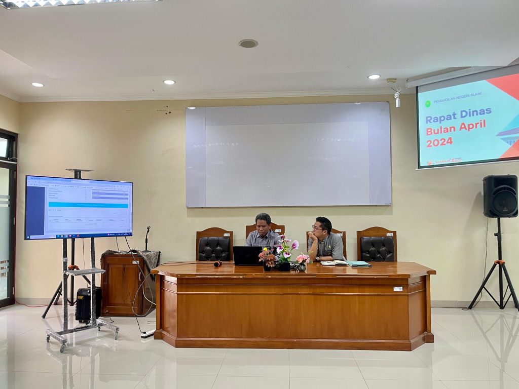 Slawi (30/4) – Pelaksanaan Rapat Dinas Bulan Maret Tahun 2024 dipimpin oleh Ketua Pengadilan Negeri Slawi Bapak Dr. Muhammad Adil Kasim, S.H., M.H.. didampingi Wakil Ketua Pengadilan Negeri Slawi Bapak Oki Basuki Rachmat, S.H., M.M., M.H. dengan agenda reviu kinerja dalam 1 bulan berjalan ini.