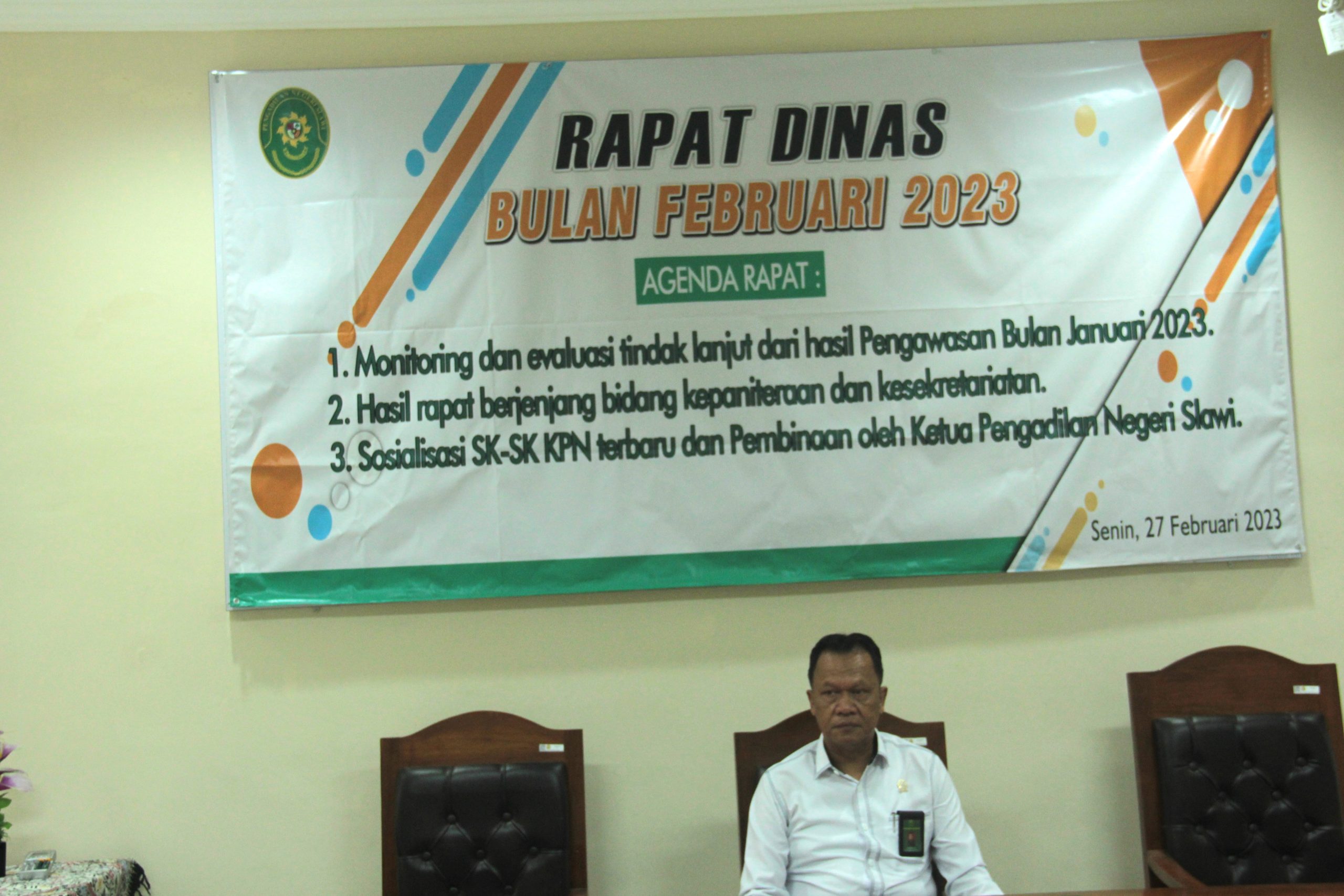 Pengadilan Negeri Slawi telah melaksanakan Rapat Dinas Bulan Februari bertempat di Ruang Aula Pengadilan Negeri Slawi dan dihadiri oleh Ketua, Para Hakim, Panitera, Sekretaris, Pejabat Struktural dan Fungsional serta seluruh Pegawai Pengadilan Negeri Slawi, dengan agenda rapat sebagai berikut:
