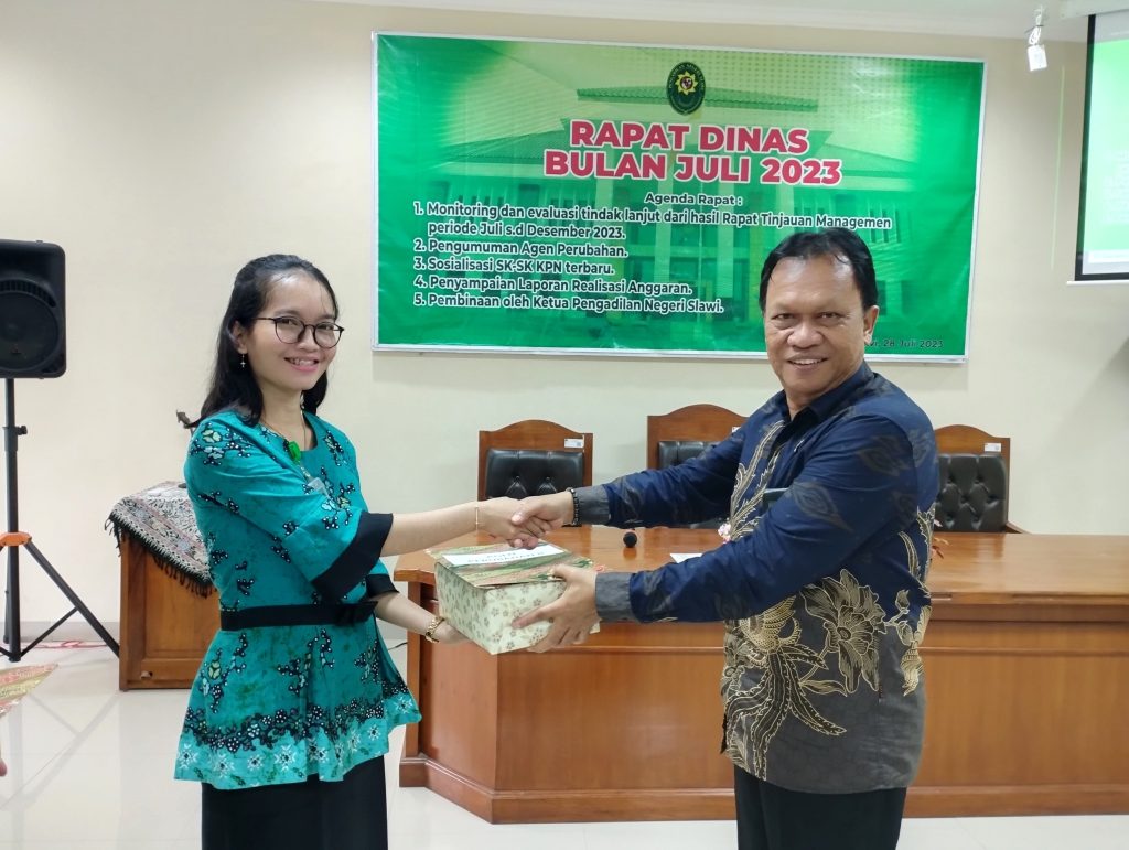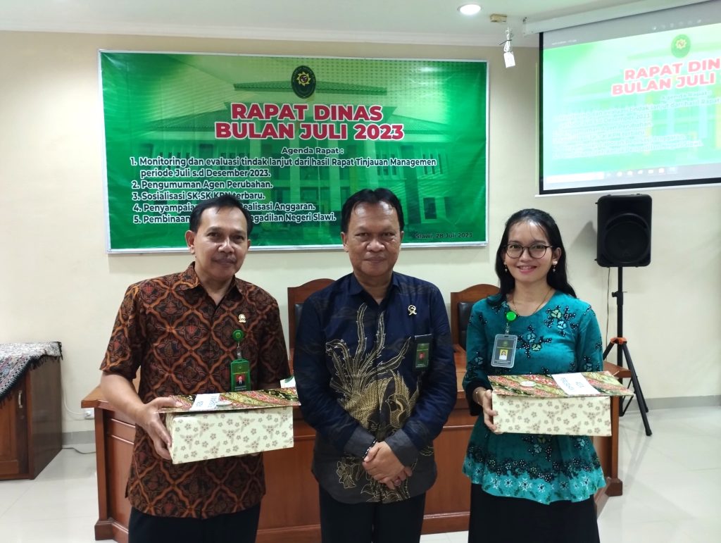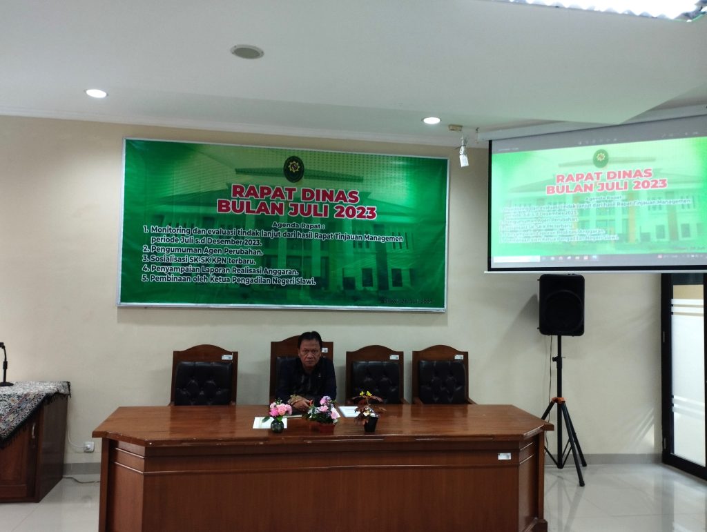 Slawi, 28 Juli 2023, Bertempat di Ruang Aula Pengadilan Negeri Slawi telah dilaksanakan Rapat Dinas Bulan Juli 2023, yang dipimpin oleh Ketua Pengadilan Negeri Slawi, dengan dihadiri Para Hakim, Panitera, Sekretaris, Pejabat Struktural dan Fungsional serta seluruh Pegawai, dengan agenda rapat sebagai berikut :