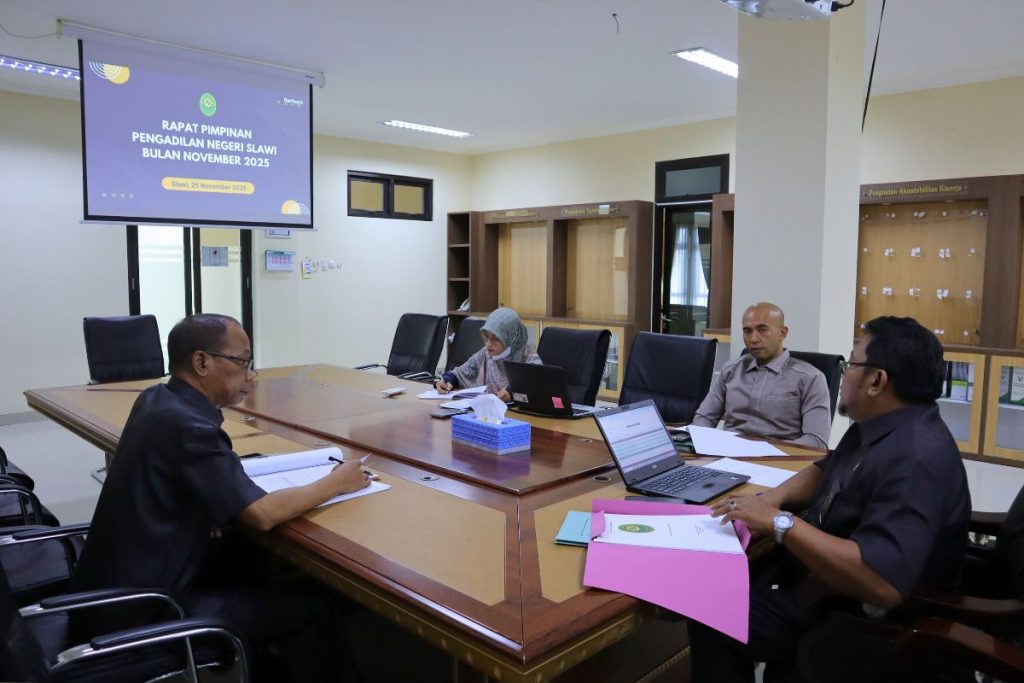 Slawi (25/11) – Pengadilan Negeri Slawi melaksanakan Rapat Pimpinan Periode November 2025 pada Selasa, 25 November 2025. Rapat dipimpin langsung oleh Ketua Pengadilan Negeri Slawi dan diikuti oleh Panitera, Sekretaris, serta Kasubag Kepegawaian dan Ortala sebagai notulis. Rapat ini merupakan rapat pimpinan kedua setelah adanya pergantian Ketua Pengadilan.