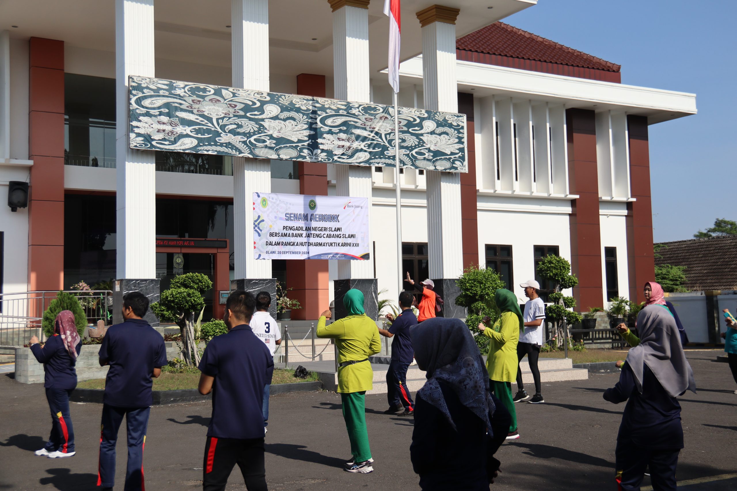 Slawi (20/9) – Pengadilan Negeri Slawi mengadakan kegiatan senam aerobik bersama dengan Bank Jateng Cabang Slawi dalam rangka memperingati Hari Ulang Tahun Dharmayukti Karini XXII.