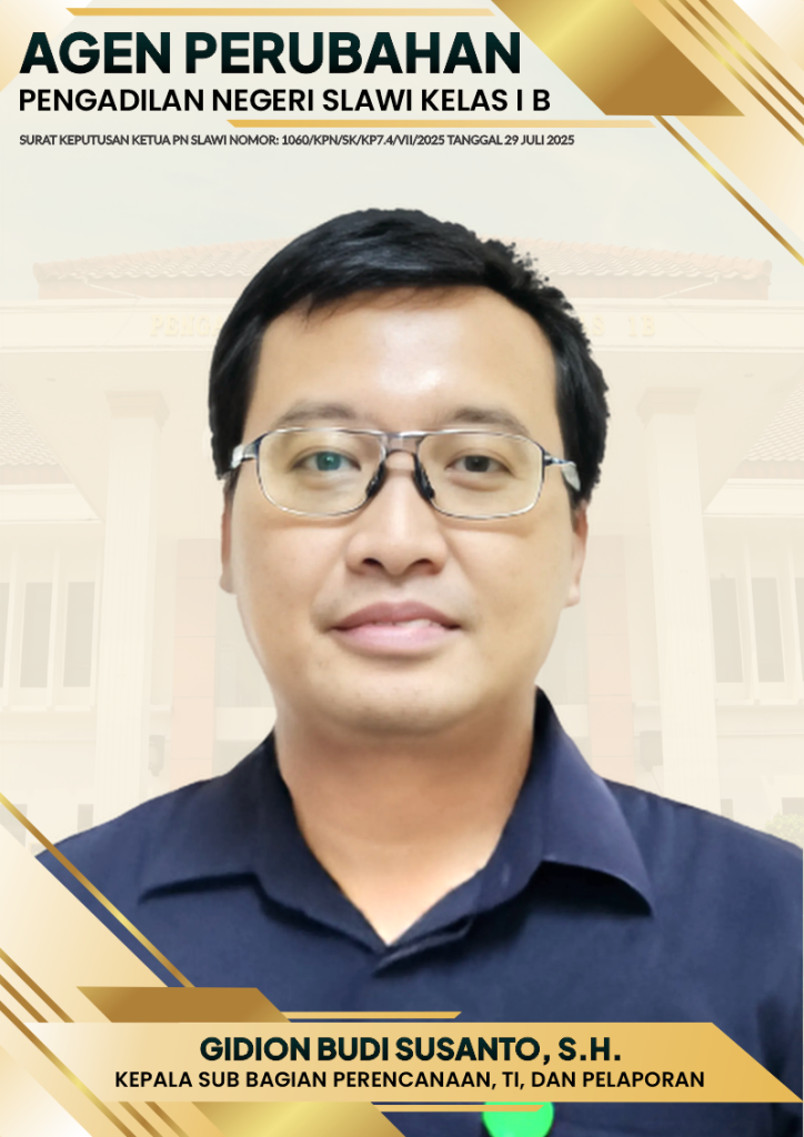 GIDION BUDI SUSANTO, S.H. AGEN PERUBAHAN JABATAN: Kepala Subbagian, Subbagian Perencanaan, Teknologi Informasi, dan Pelaporan NIP: 198211262009041002 Pangkat/Gol.: Penata (III/c)